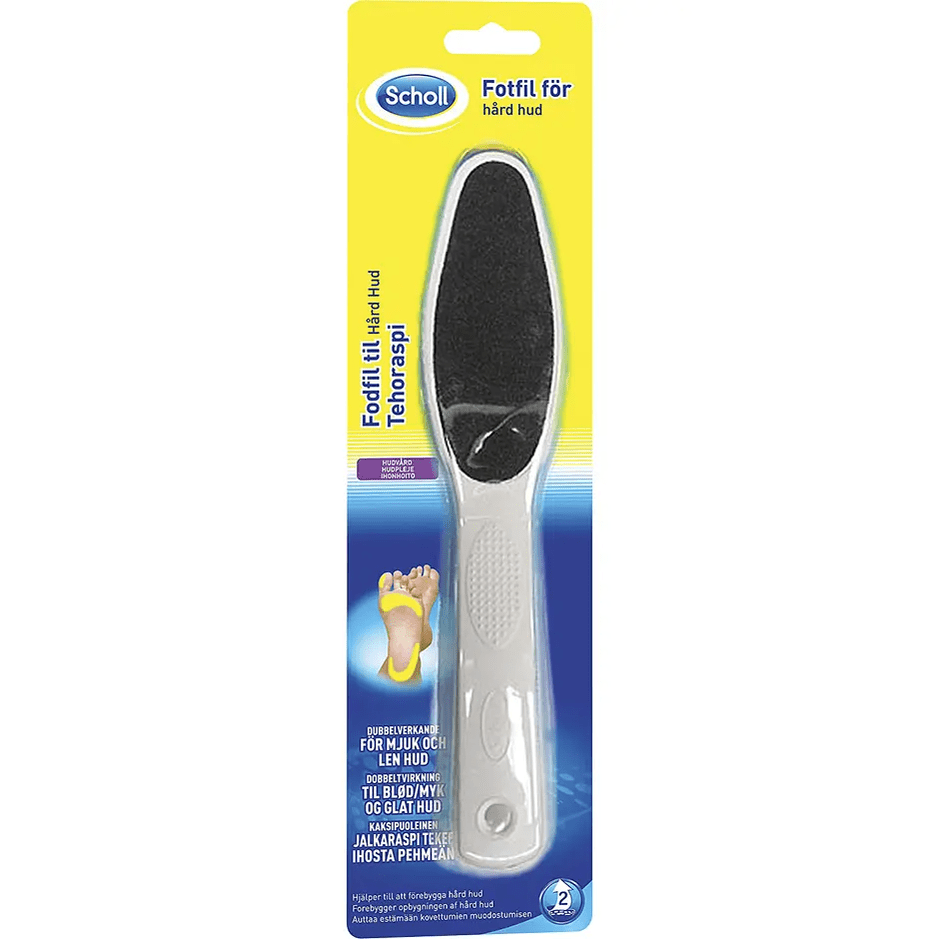 Denna klassiska fotfil har en grov och en fin slipyta som effektivt tar bort förhårdnader och gör huden mjukare. Använd den på torr eller fuktig hud beroende på behov.