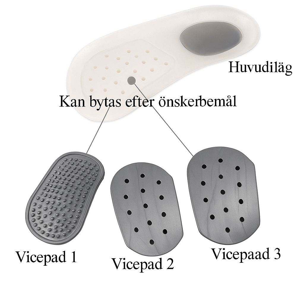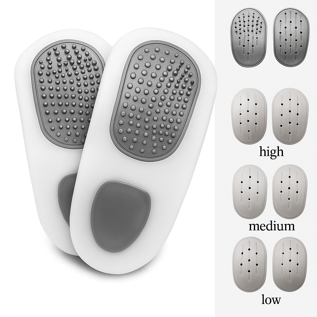 Dessa hålfotsstöd används för att minska inåtvridning (överpronation) vid gång och löpning. Setet innehåller fyra olika plattor för individuell justering av stödets nivå. Idealisk lösning vid belastning i fotvalv, knä eller höft.
