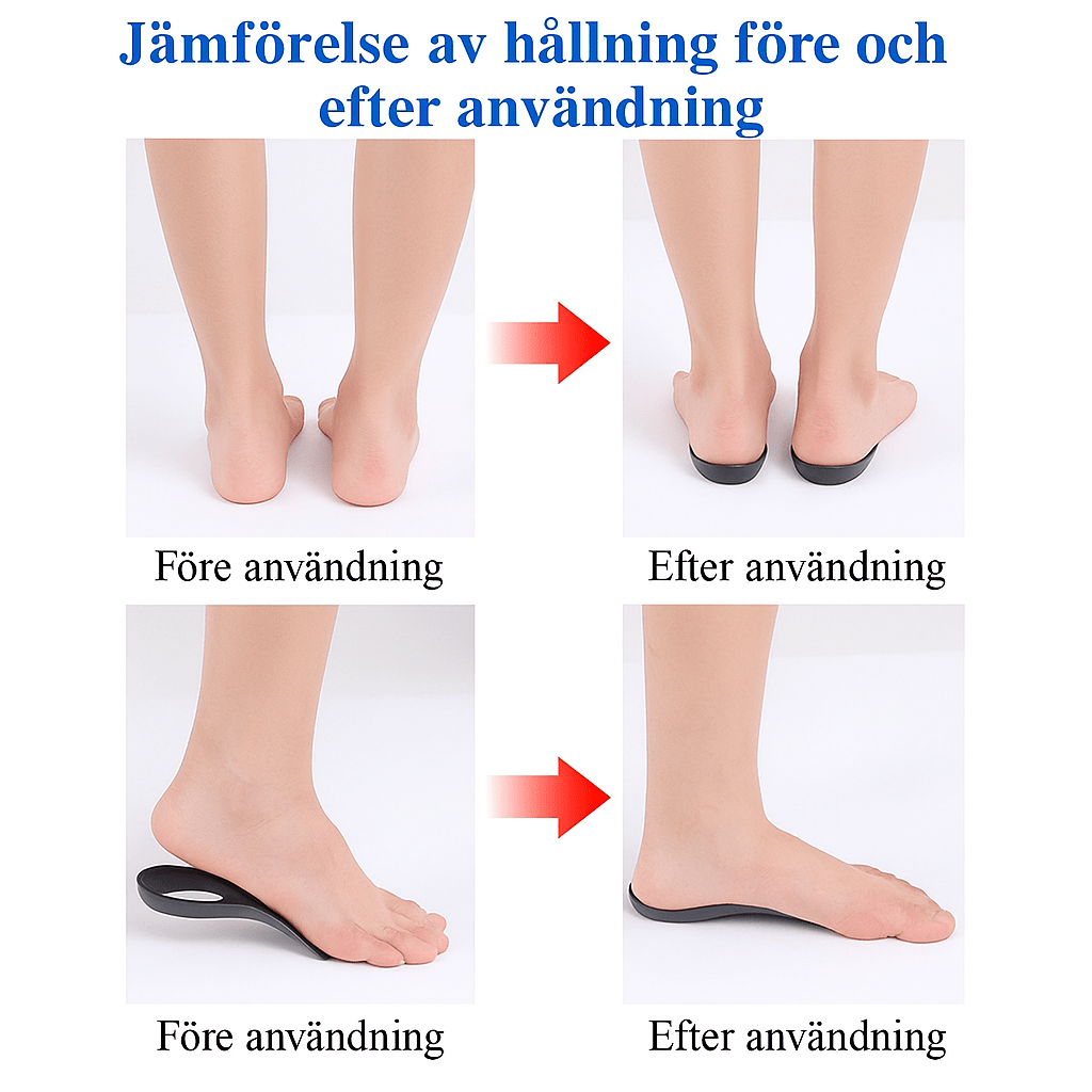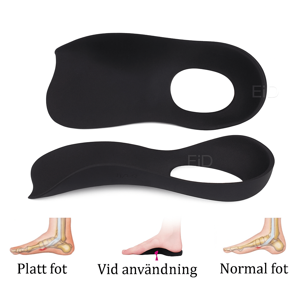 Dessa inlägg är särskilt utformade för att korrigera fotvalvet vid plattfot och minska obehag i hälar, fotleder och hålfot. Den stötdämpande mjukplasten ger en behaglig känsla och främjar korrekt fotställning vid varje steg.